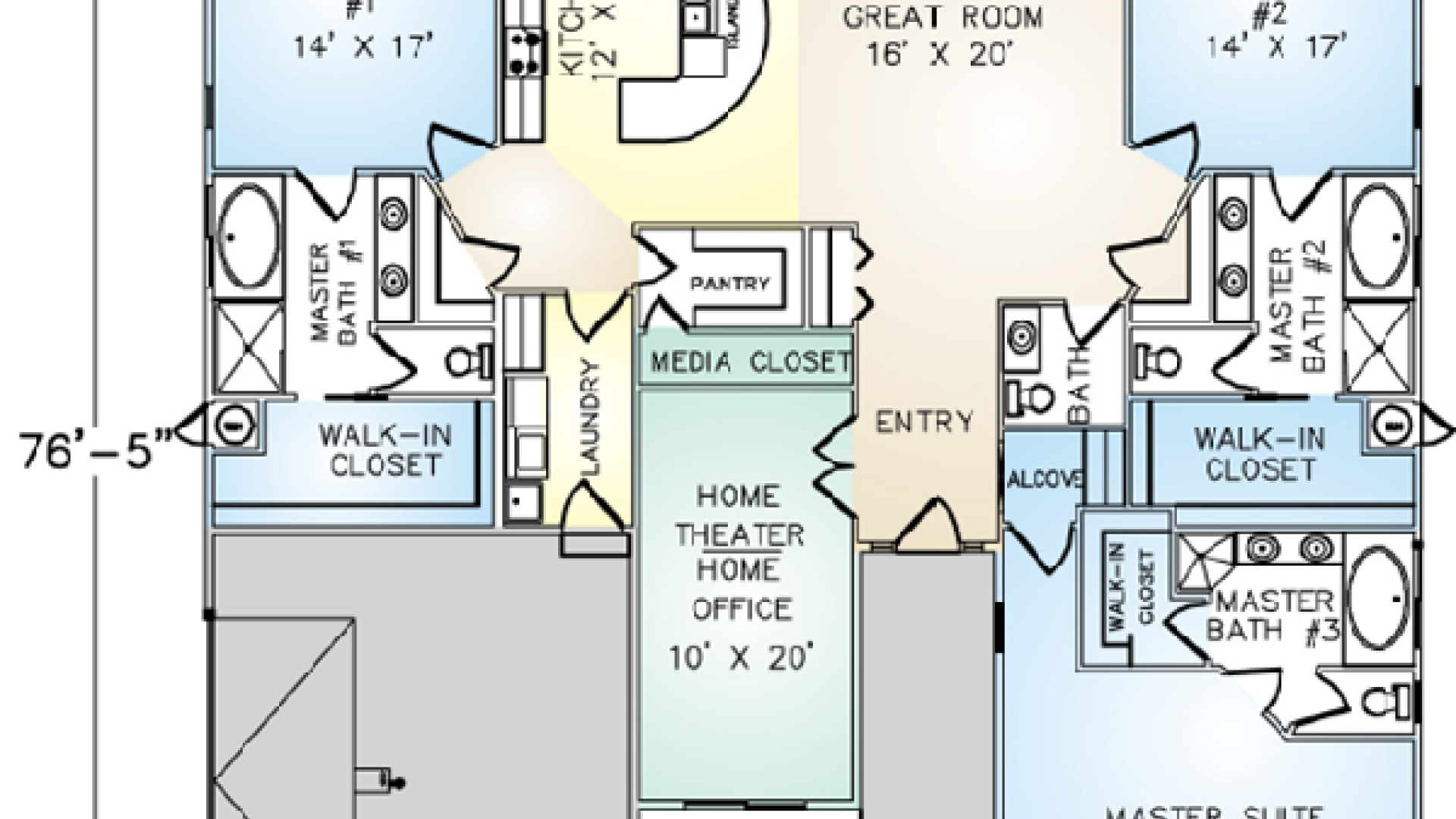 The Murrieta panelized kit home is a modern design that features multiple master suites branching away from a central dining and entertainment space. Each suite contains a full bath, with generous storage space provided by a walk-in closet. Ten-foot volume ceilings allow a more spacious feel throughout the house. The plan includes a self-contained media room with an enclosed closet for wiring and hardware accessibility. The garage showcases a side-entry design with room for multiple vehicles.