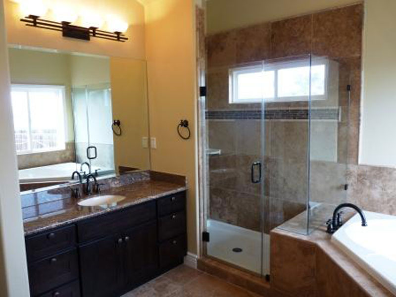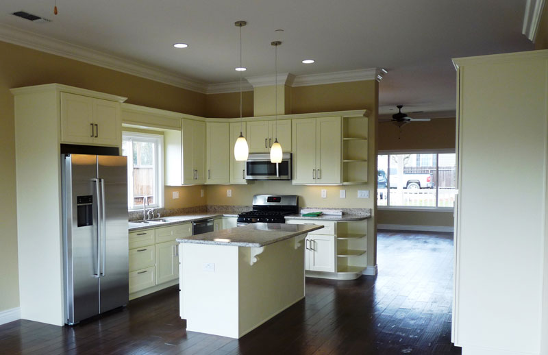 With the help of our Dealer, California Pre-Cut Homes, this client took one of PMHI's most popular floor plans, the Riverbend, and created their own custom home at an affordable price. They took off the large covered porch and added two smaller porches on the front and rear. They added an office a walk-in closet to the master bedroom, and enlarged the garage. They also changed some of the window designs and sizes, as well as some doors. They enlarged the house to 2,138 sq. ft., with 10' high walls. The new design has 3 bedrooms, 2 bathrooms, an office, and a larger 2 car garage. Inside is a gorgeous bright kitchen with granite countertops and stainless steel appliances.