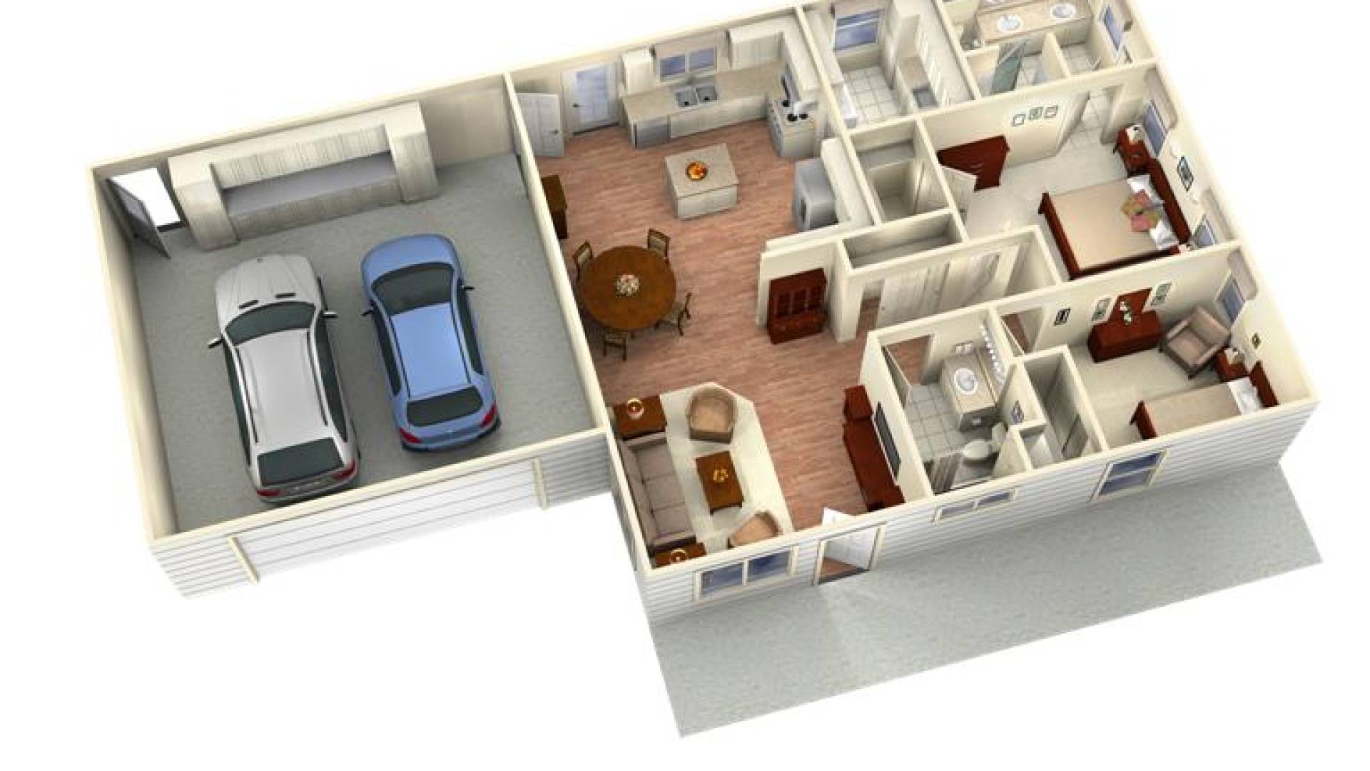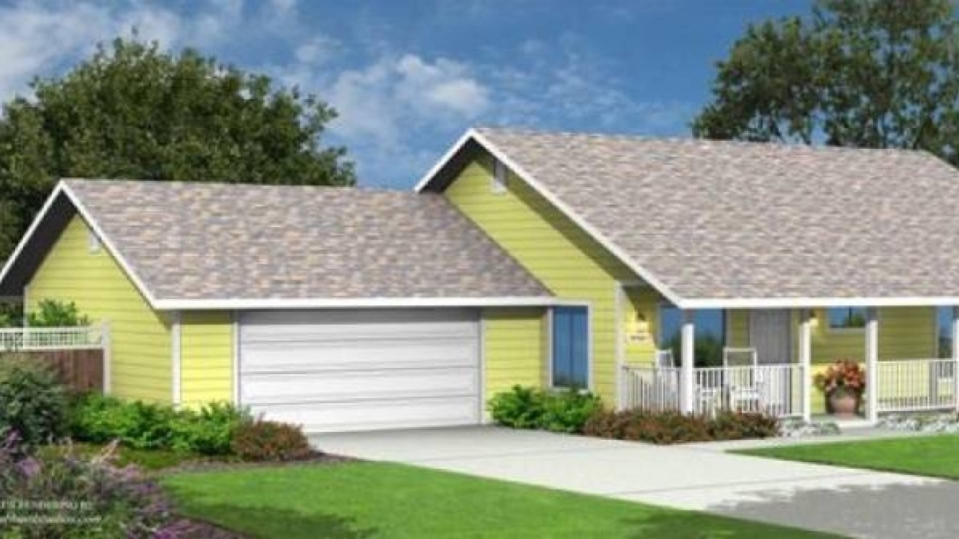 The Bodega panelized kit home features a full front porch that opens up into a spacious great room with vaulted ceiling. The kitchen is centrally located with ready access to the backyard, garage, and nearby laundry/storage room with wash tub. The master bedroom and bath offer abundant storage space and feature a walk-in shower and double sink area. The two-car attached garage can be modified or detached if required.